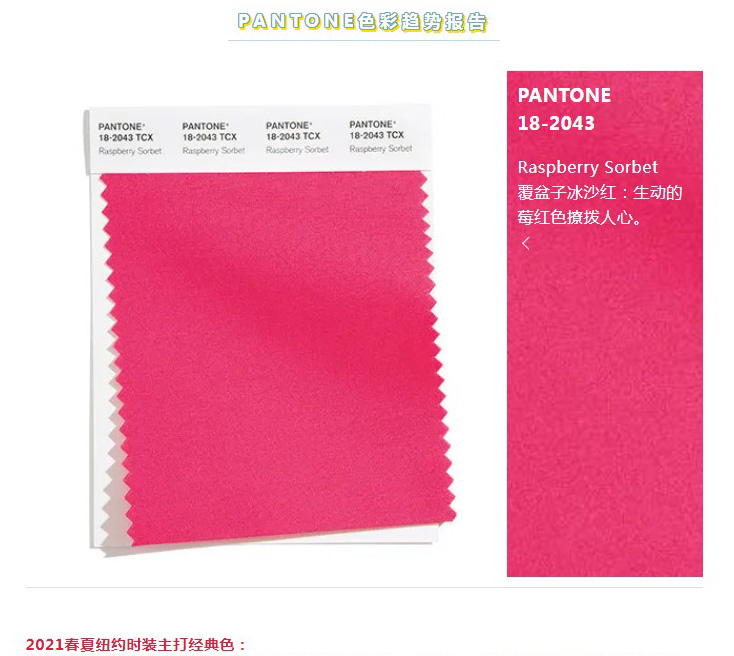 近日,美國色彩機構PANTONE發(fā)布了2021春夏季紐約時裝周流行色趨勢報告。彩通色彩研究所 (Pantone Color Institute?) 附屬彩通公司專責提供潮流趨勢預測及色彩咨詢服務,這一季的報告包含10種流行色彩以及5種當季主打的核心經(jīng)典色彩,預告在紐約時裝周里的設計師們介紹新春夏作品系列時能看到這些色彩。